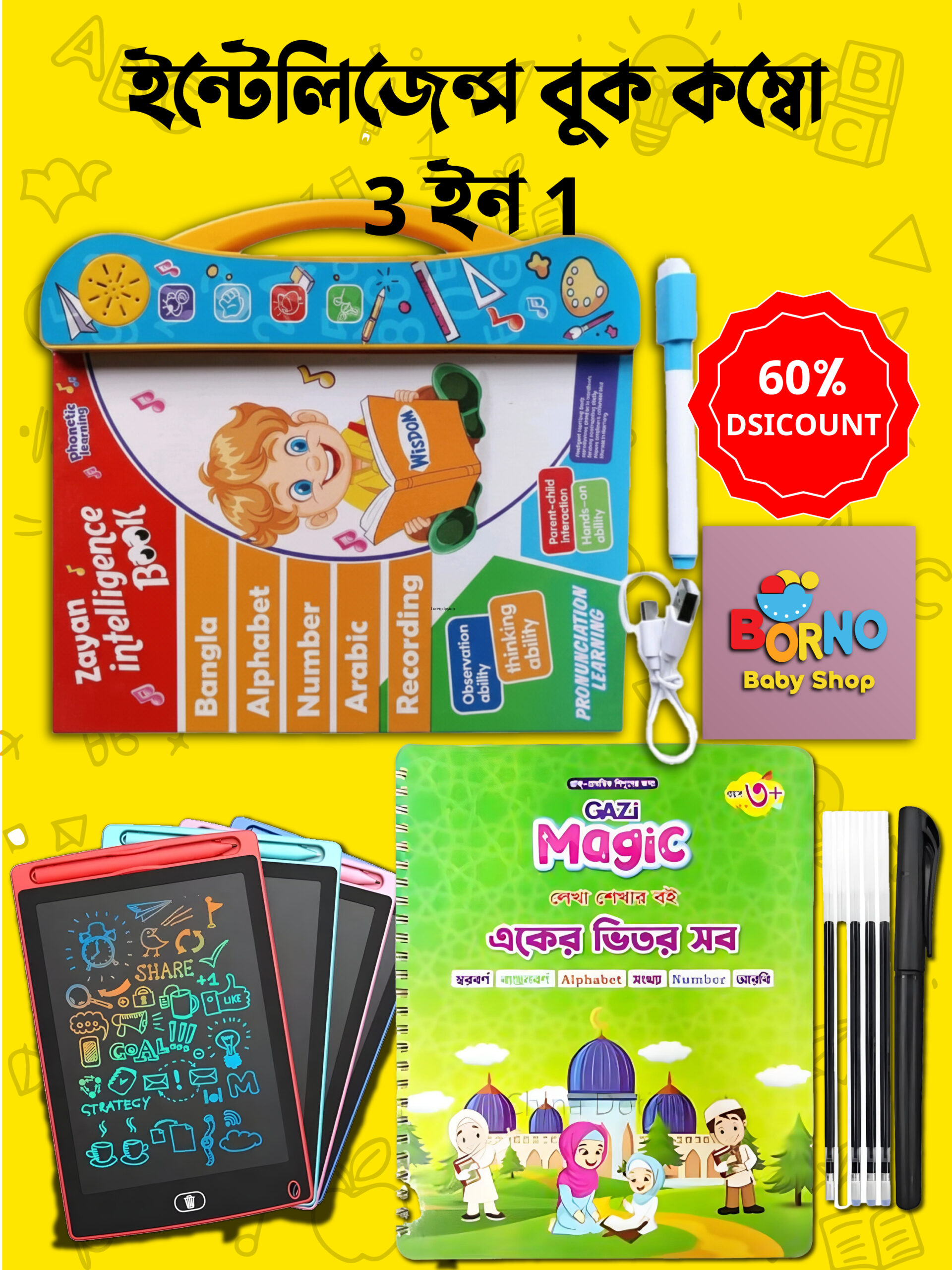 * **ভাষার বহুমাত্রিক শেখা**: বাংলা, ইংরেজি ও আরবি অক্ষর, নাম্বার ও শব্দ শেখার সুযোগ। ([Kaif Mart][1])